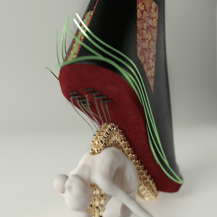 D.VIUS is a conceptual footwear collection comprising three unique designs created for a design competition, where each shoe merges architectural aesthetics with avant-garde expression. The entire process—from modeling and texturing to scene composition and final rendering—was meticulously executed using Rhino + Grasshopper for parametric structuring, Blender and Cinema 4D for asset development, and Redshift for photorealistic rendering. The result is a bold visual narrative that pushes the boundaries between fashion, sculpture, and digital fabrication.